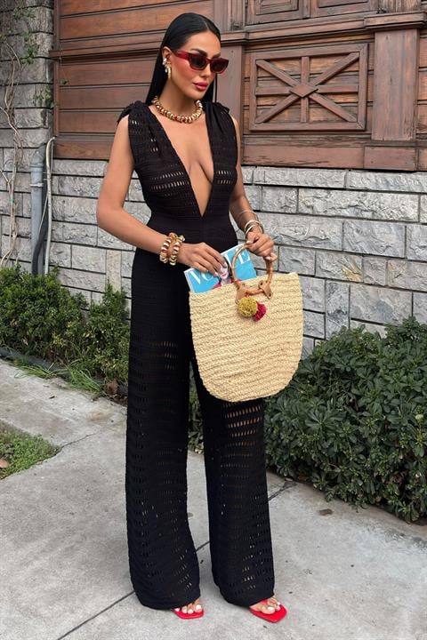Half-Zip Relaxed Knit Jumper with Contrast Collar – Black