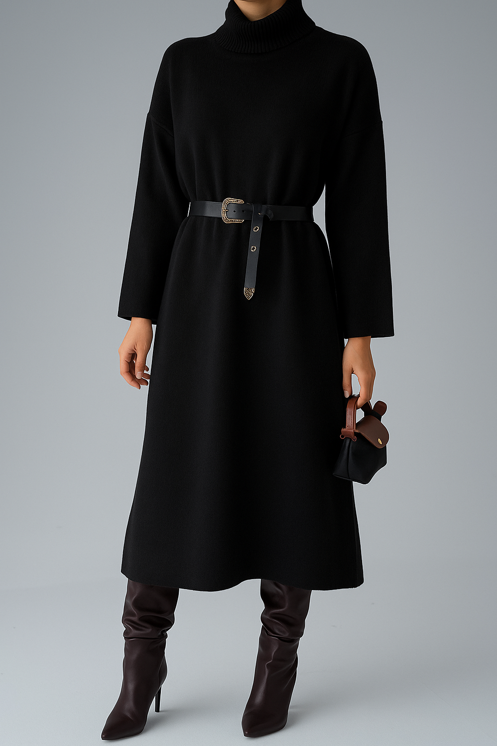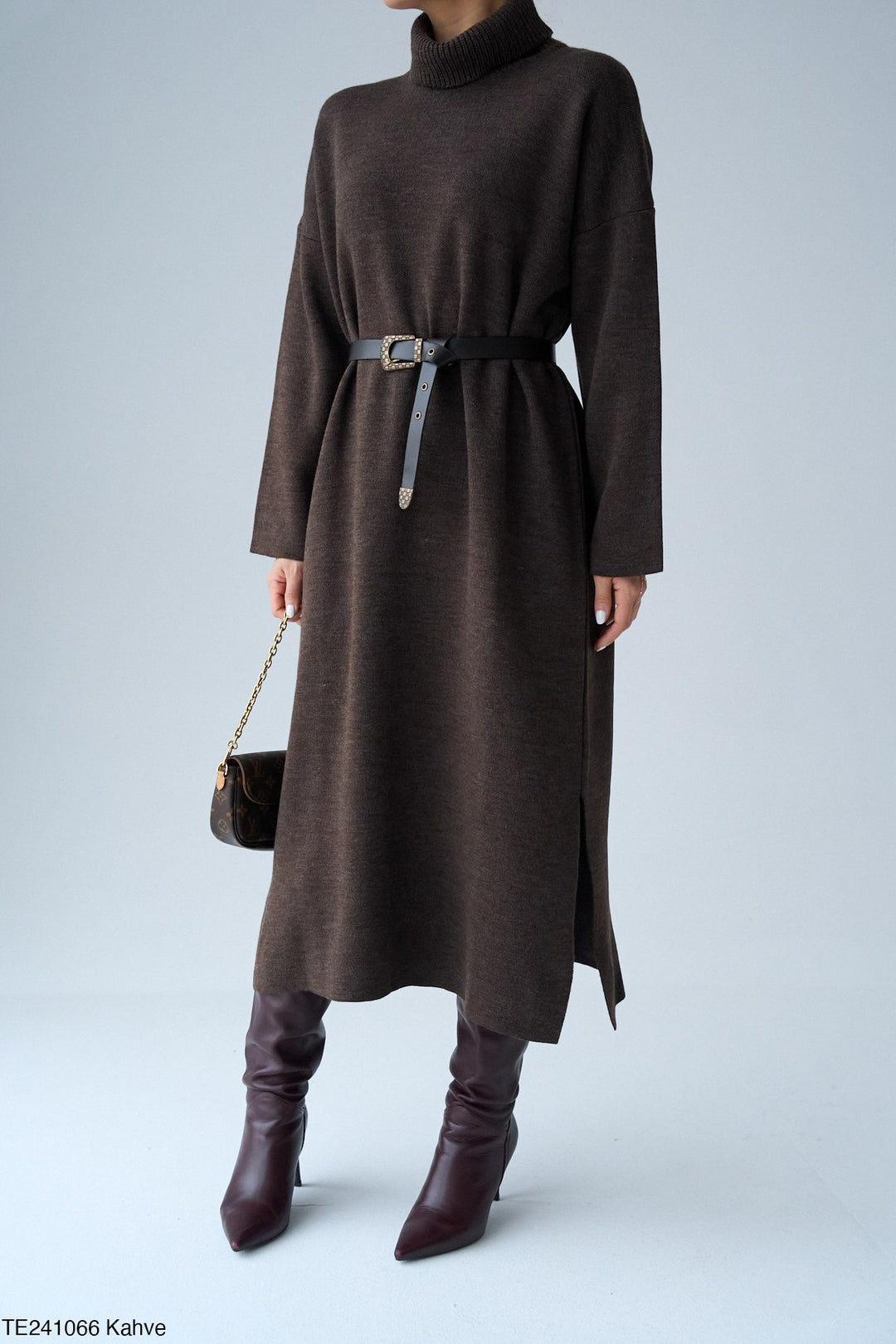 Roll-Neck Relaxed Knit Dress in Chocolate