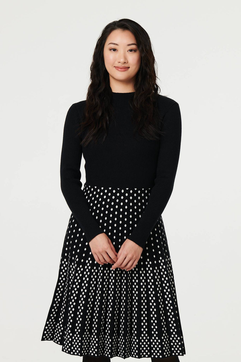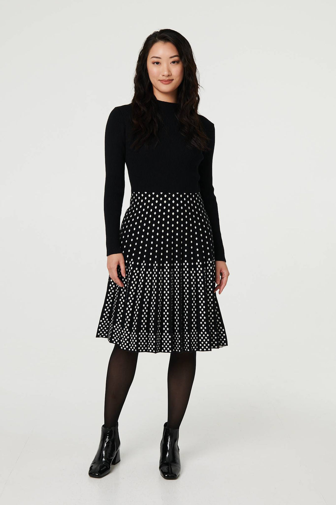 Polka Dot Pleated Knit Skater Midi Dress
