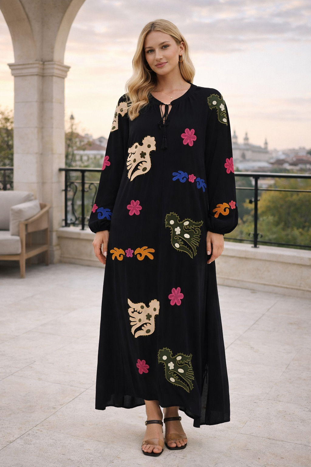 Embroidered Maxi Dress with Tie Neck Detail in Black