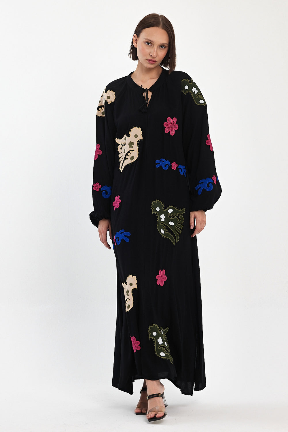 Embroidered Contrast Trim Maxi Kaftan Dress in Black