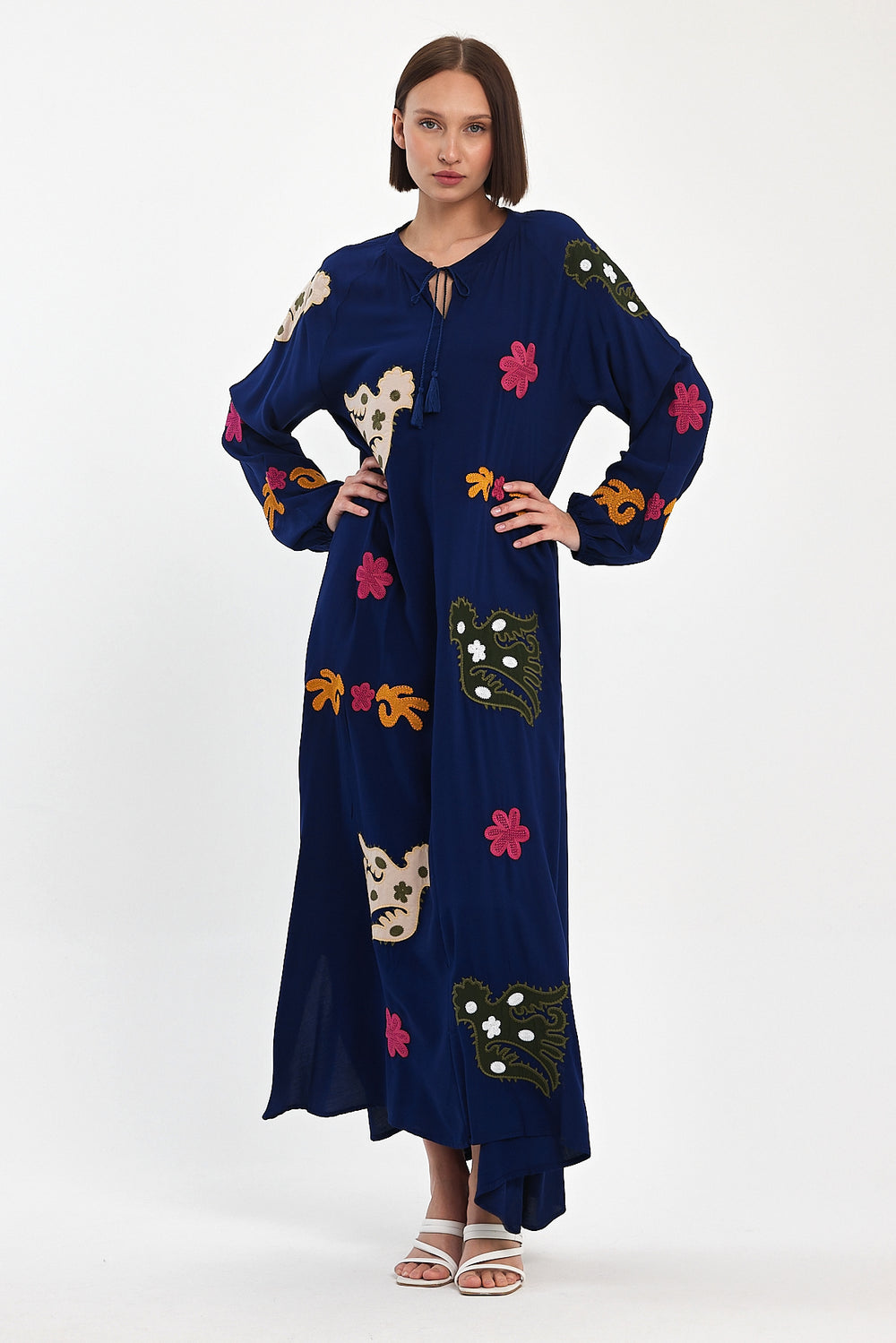 Embroidered Maxi Dress with Statement Motifs in Navy Blue