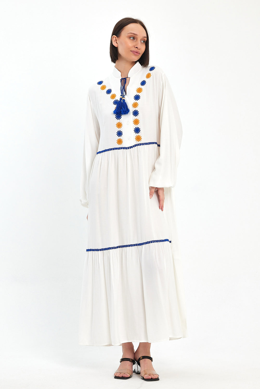 Embroidered Maxi Dress with Tassel Tie Neck in White