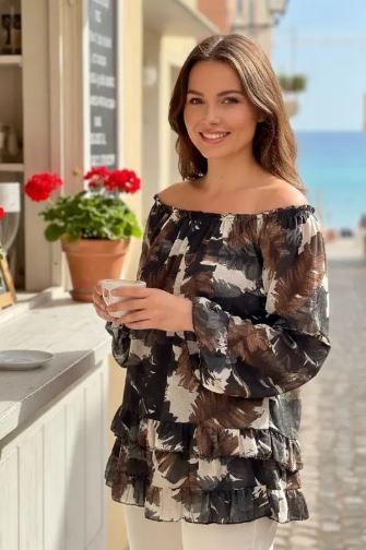 Frilled Hem Palm Feather Bardot Blouse - jqwholesale.com