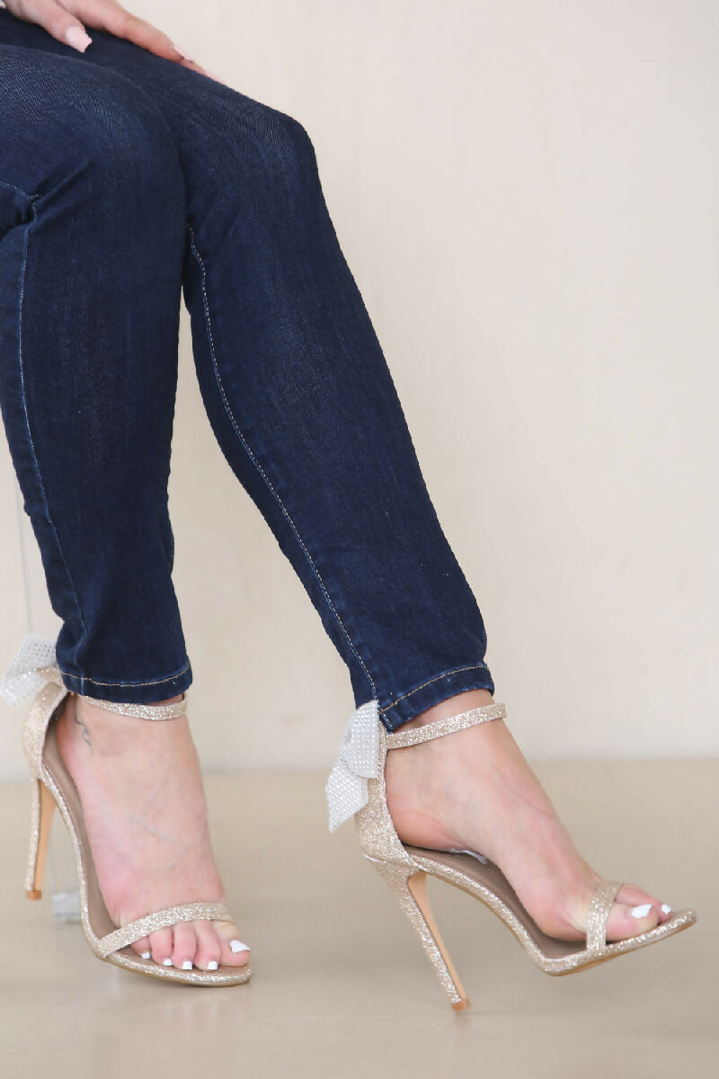 CHAMPAGNE GLITTER BOW EMBELLISHED HIGH HEEL PARTY SANDALS (PACK OF 12 PAIRS UK3-UK8)