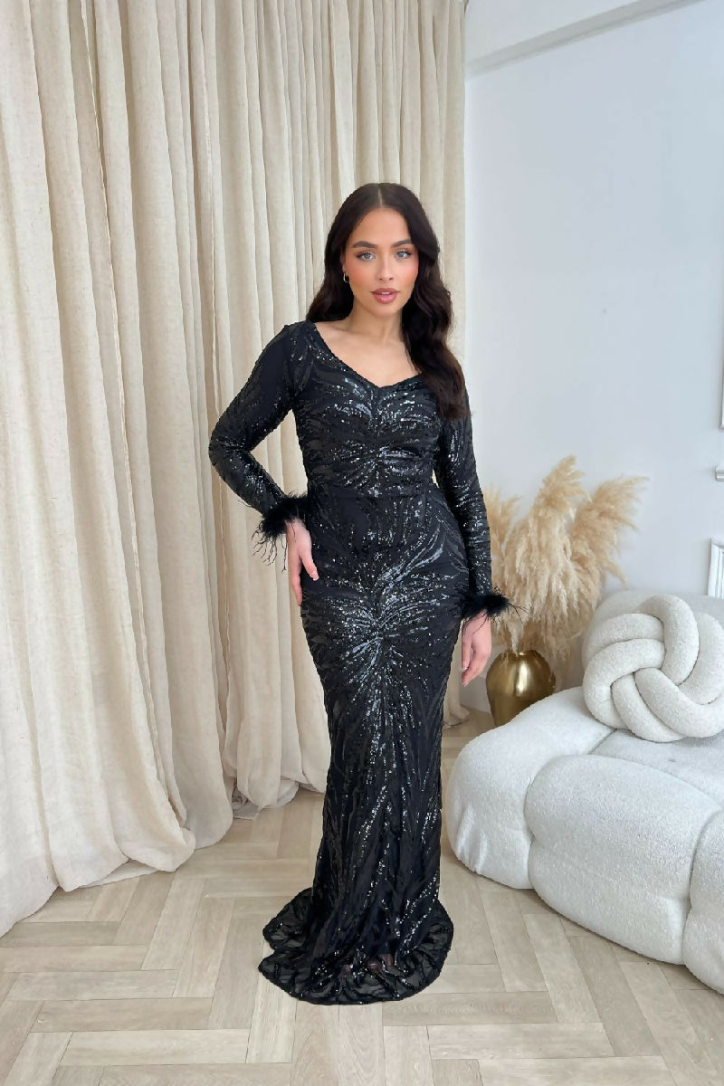Make a bold statement with the Luminous Black Luxe Sequin Maxi Dress, a timeless and elegant gown perfect for glamorous occasions. Designed with a premium stretch sequin outer, feather-trimmed cuffs, and a fitted mermaid silhouette, this dress exudes sophistication and style.
