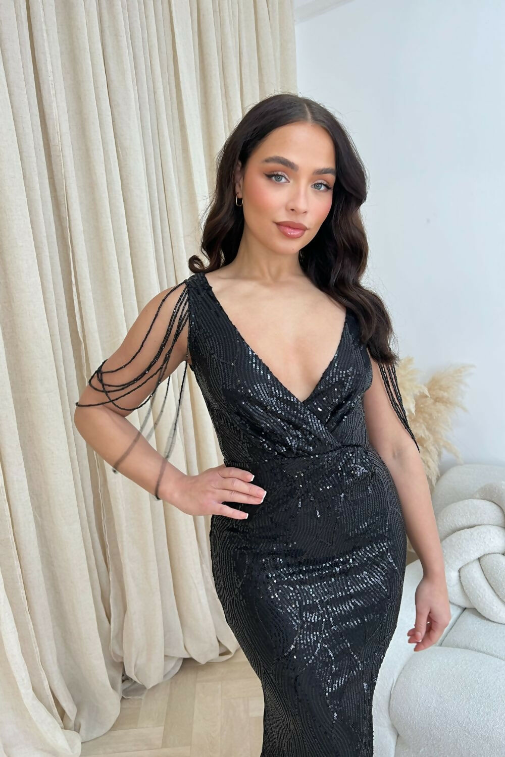Make a bold statement with the stunning Escala Maxi Dress in Black. This premium gown exudes timeless elegance and modern glamour, perfect for elevating any VIP occasion. Designed to enhance your silhouette, its intricate details and shimmering sequins create a captivating look that’s sure to turn heads.