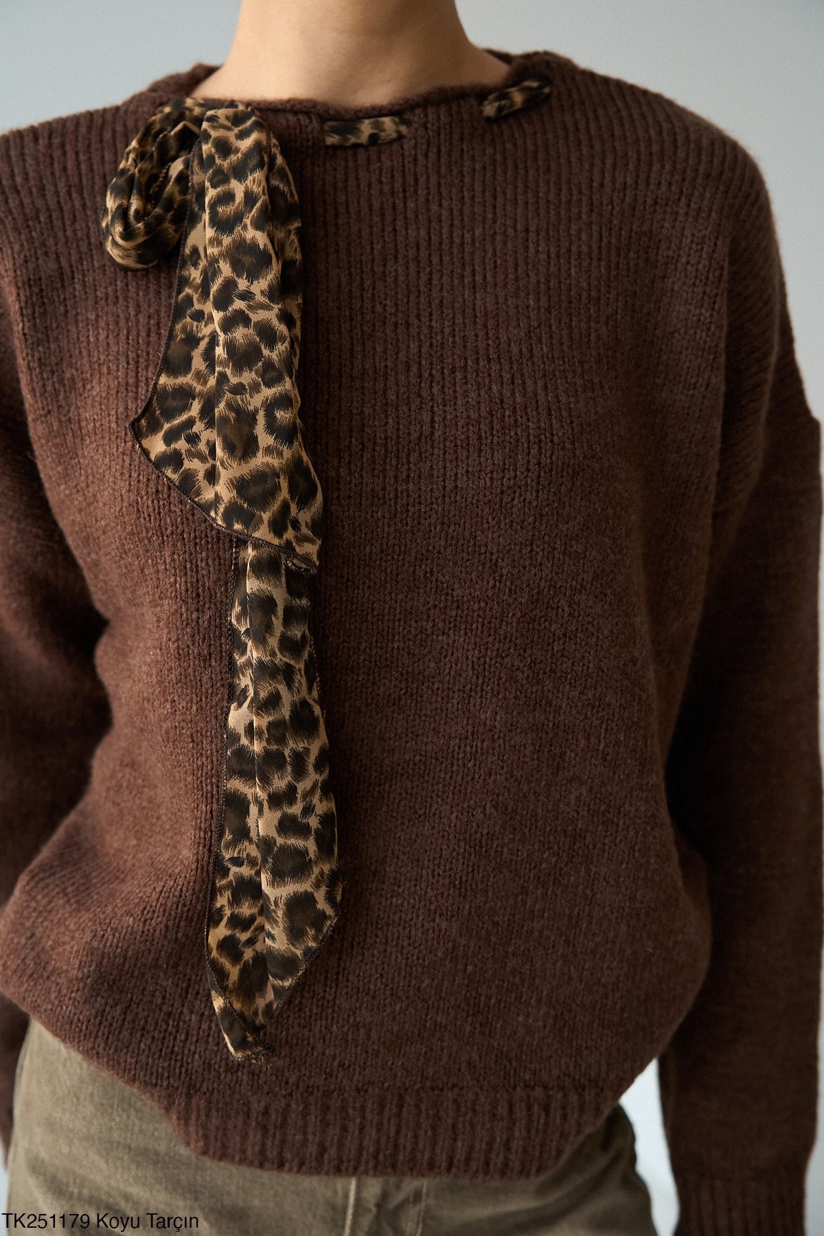 Leopard Tie Detail Soft Knit Jumper in Deep Brown
