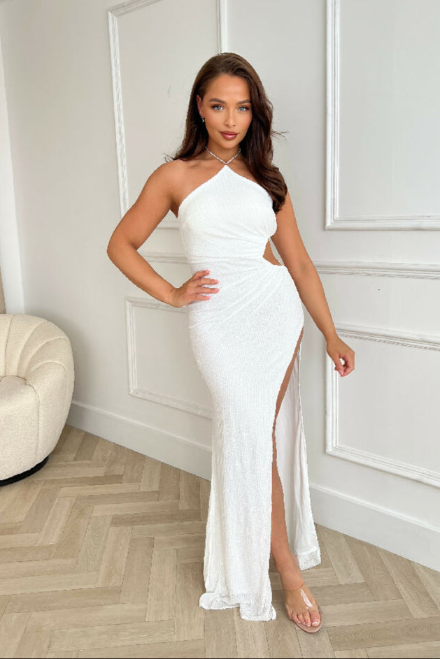 (4P.PACK) Vision White Luxe Sequin Rhinestone Halter Neck Maxi Dress