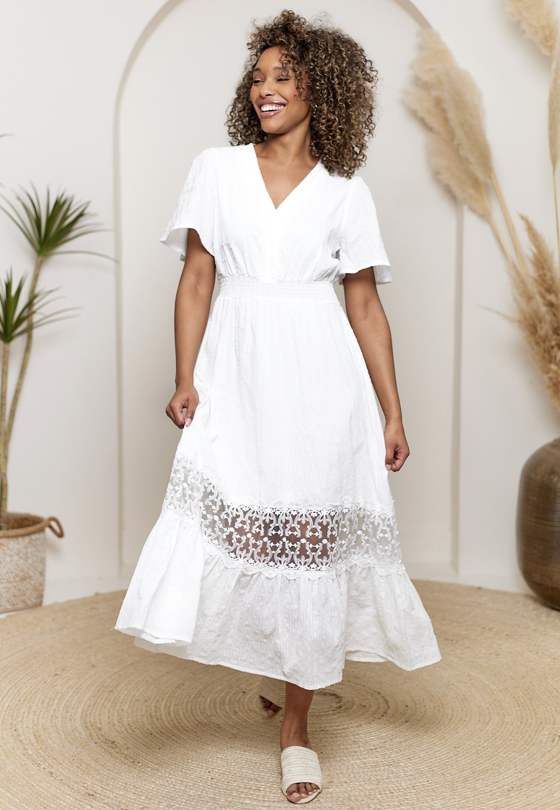 Lace Panel Detail Shirred Waist Midi Dress in White