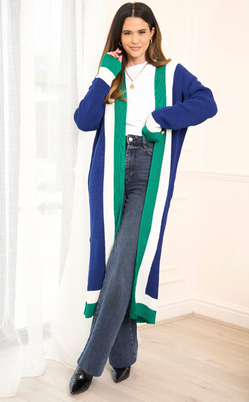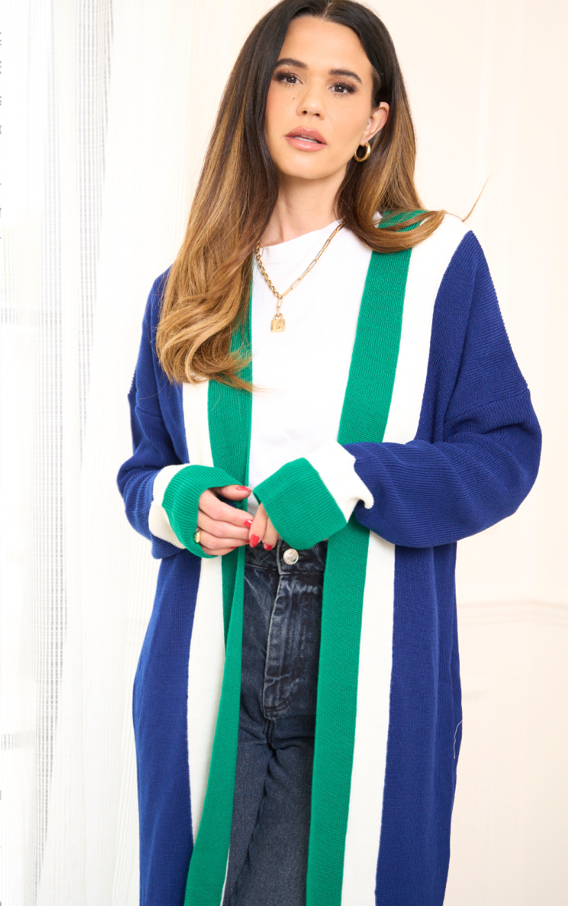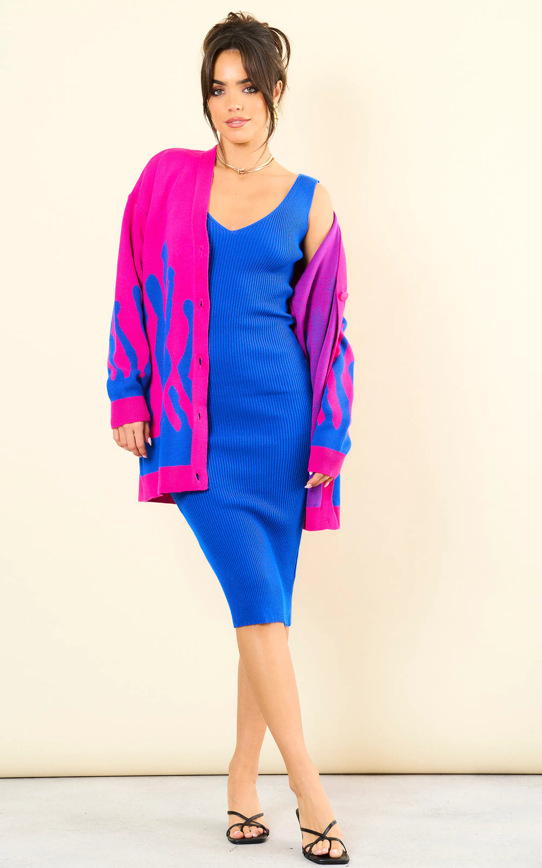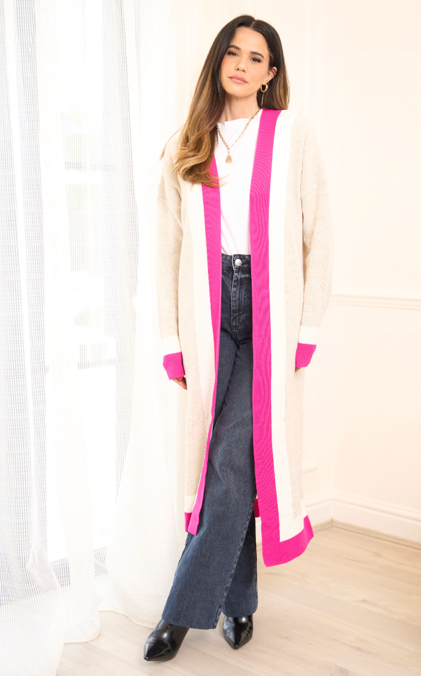 Beige & Fuchsia Color Block Longline Knit Cardigan