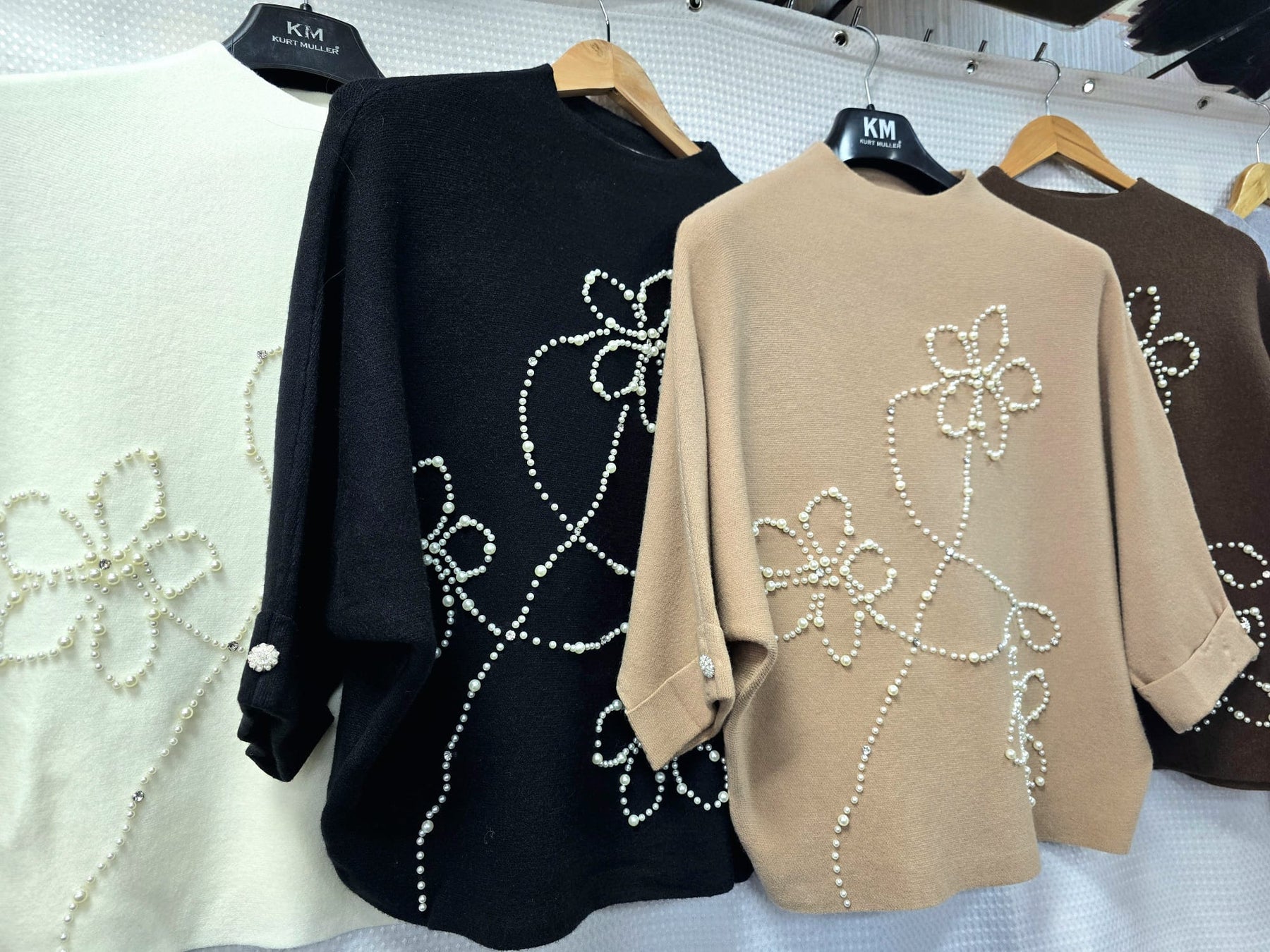 A stunning new season arrival — a soft turtle-neck knit adorned with elegant crystal and pearl embellishments. Features 3/4 sleeves finished with crystal pearl button detailing for a refined, feminine touch.