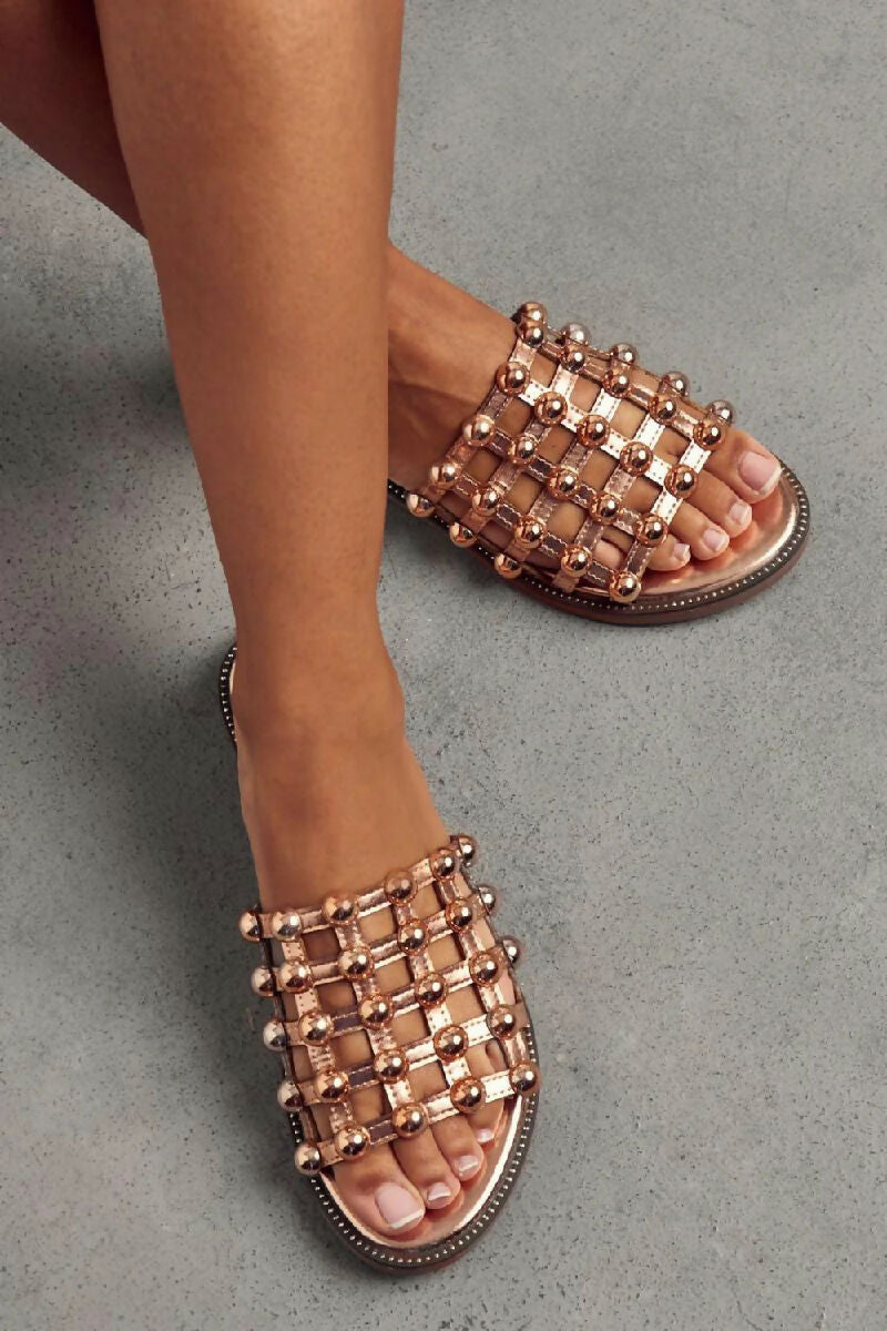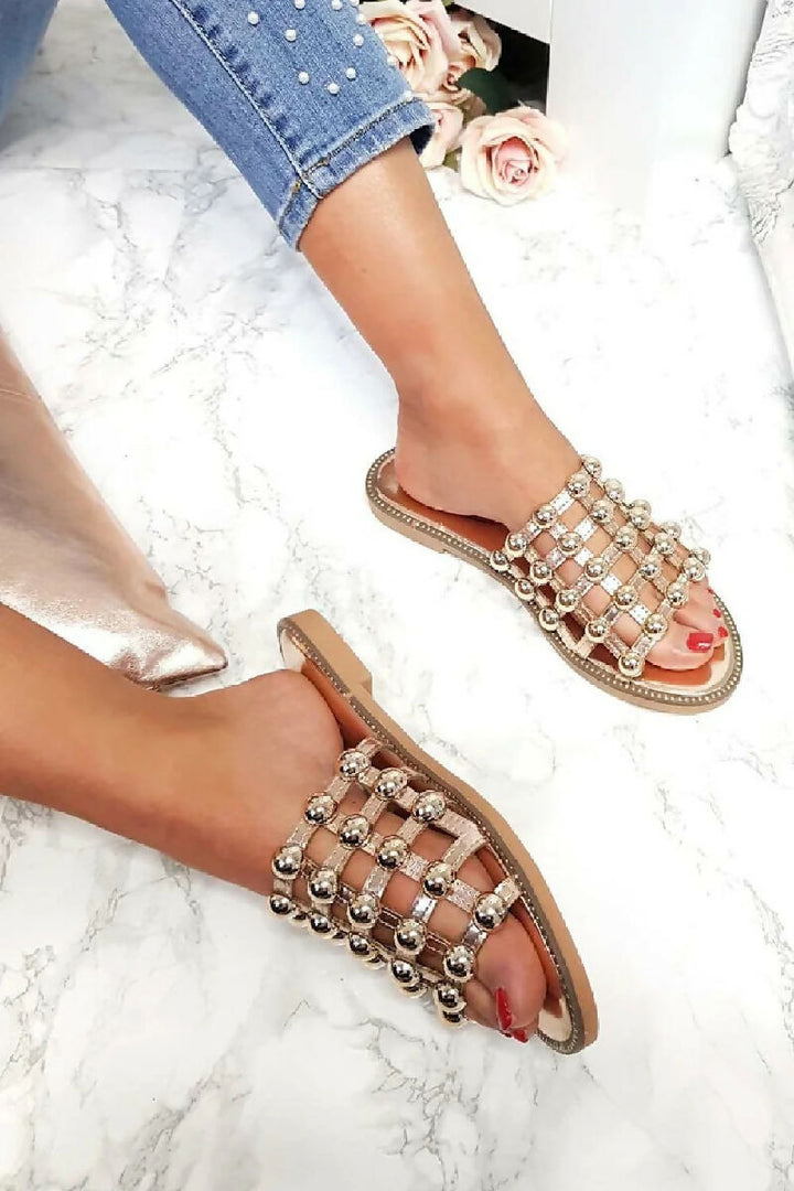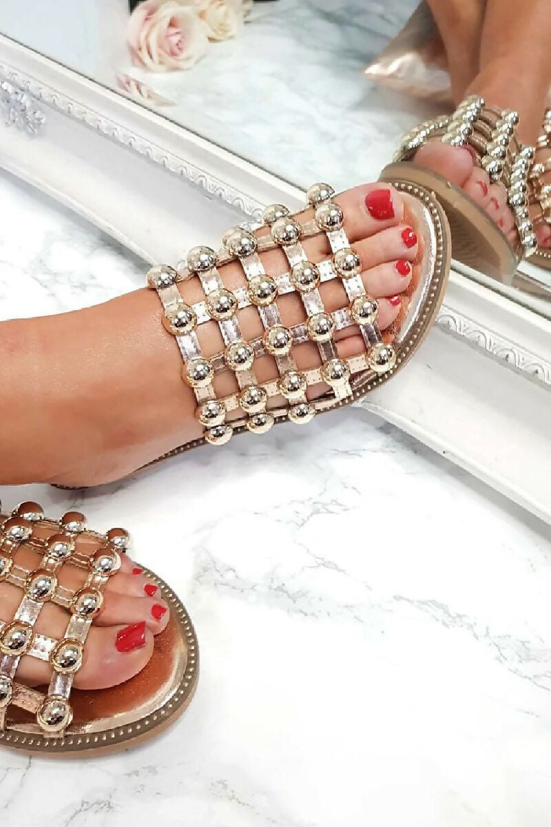 Women’s flat studded sandals with cut out cage strap finished with silver stud detailing.