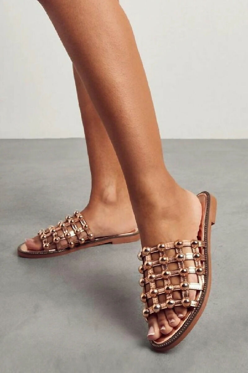 (PACK OF 6 PAIRS)-LADIES ROSE GOLD STUD DETAIL CAGED FLAT SUMMER HOLIDAY SANDALS -UK3 TO UK8 SIZES (PACK-B)